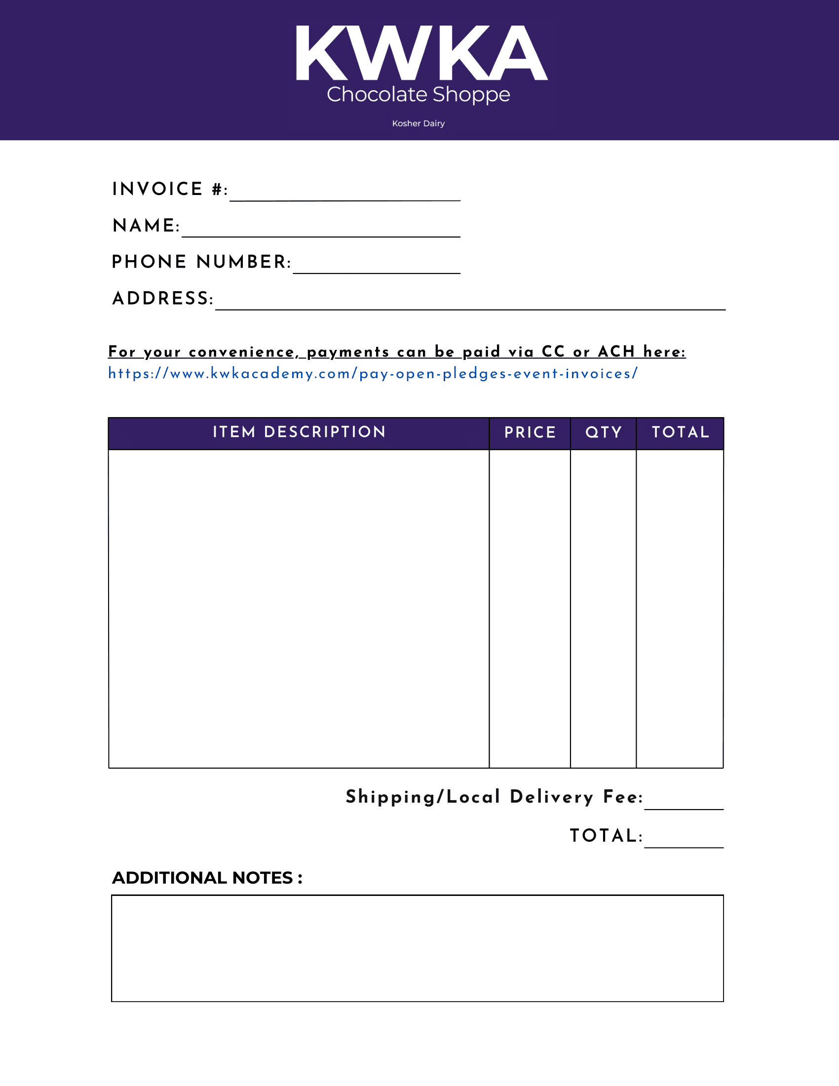 KWKA Chocolate Shoppe Order Invoice Form